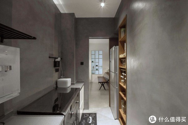 廚房簡潔干凈,去除笨重的油煙機,將消毒碗柜與烤箱整合在一起,整個空間自由許多。利用結構上的退位,定制了嵌入式儲物柜,增加廚房收納能力。冰箱同樣的嵌入式擺放,左右各預留了5公分的空間。
