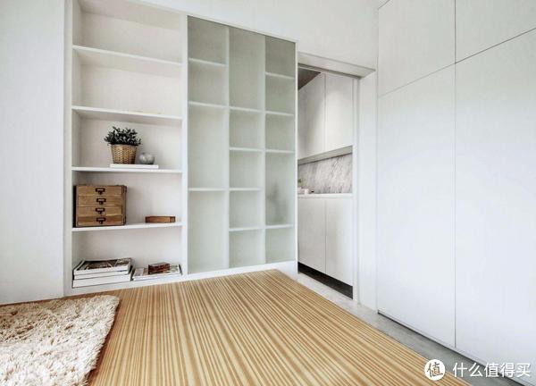 次臥簡潔明亮,一整面白色的收納柜/衣柜,是臥室外餐邊柜的延伸,增加儲物空間的同時,空間感也更強。