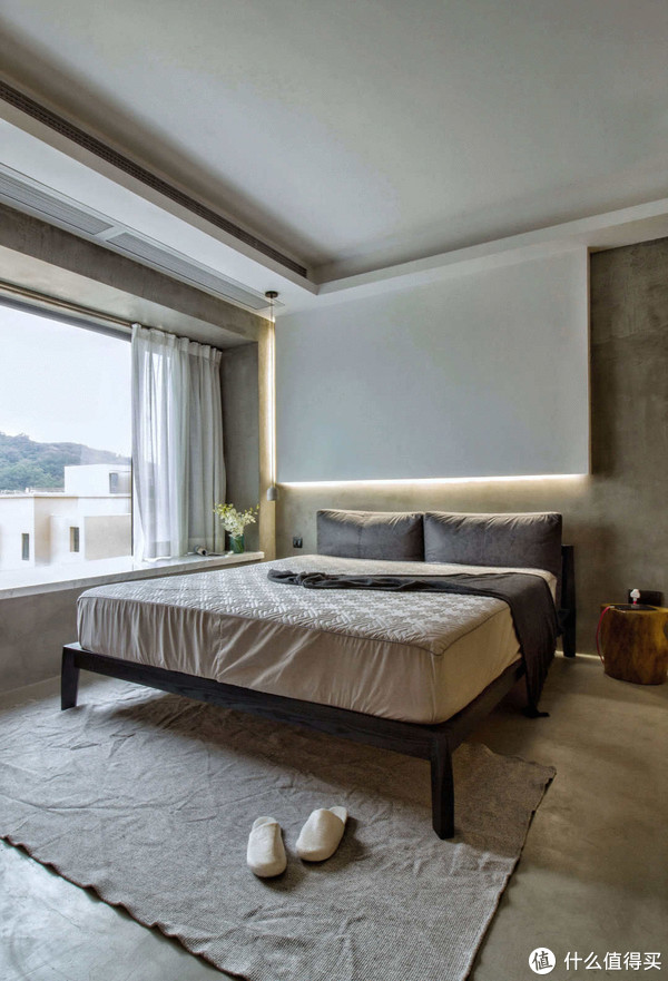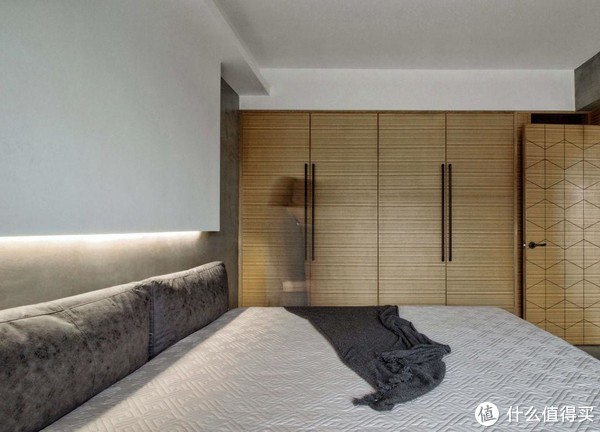 主臥延續了客廳風格,簡潔干練。燈光設計上,采用無主燈設計,在合適的位置運用燈帶,既能夠凸顯個性,又能營造舒適易睡的氛圍。