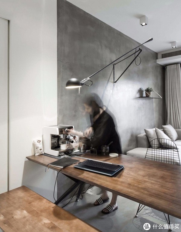 進屋與想象不符,沒有小清新的美,只有水泥墻、水泥地,剛勁有力太酷了。客餐廳一體設計,相互之間都能夠得到補充和延伸,讓空間不那么擁擠。散點式照明,可控范圍大照明效果好,也更有層次感。